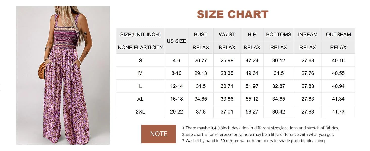 Womens jumpsuit design with sleeveless, square neck, floral print, high waist, smocked bust,wide leg long pants, two pockets, one piece jumpsuits, summer outfits for women.